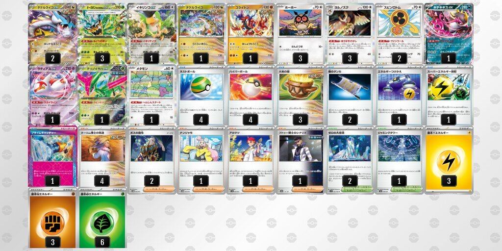 このデッキは、タケルライコexとオーガポンみどりのめんを主軸にしたデッキ構成となります。現環境(Gレギュレーション)で対戦に必要なカードが揃っています。初心者から上級者まで、幅広い方にご活用いただける内容です!